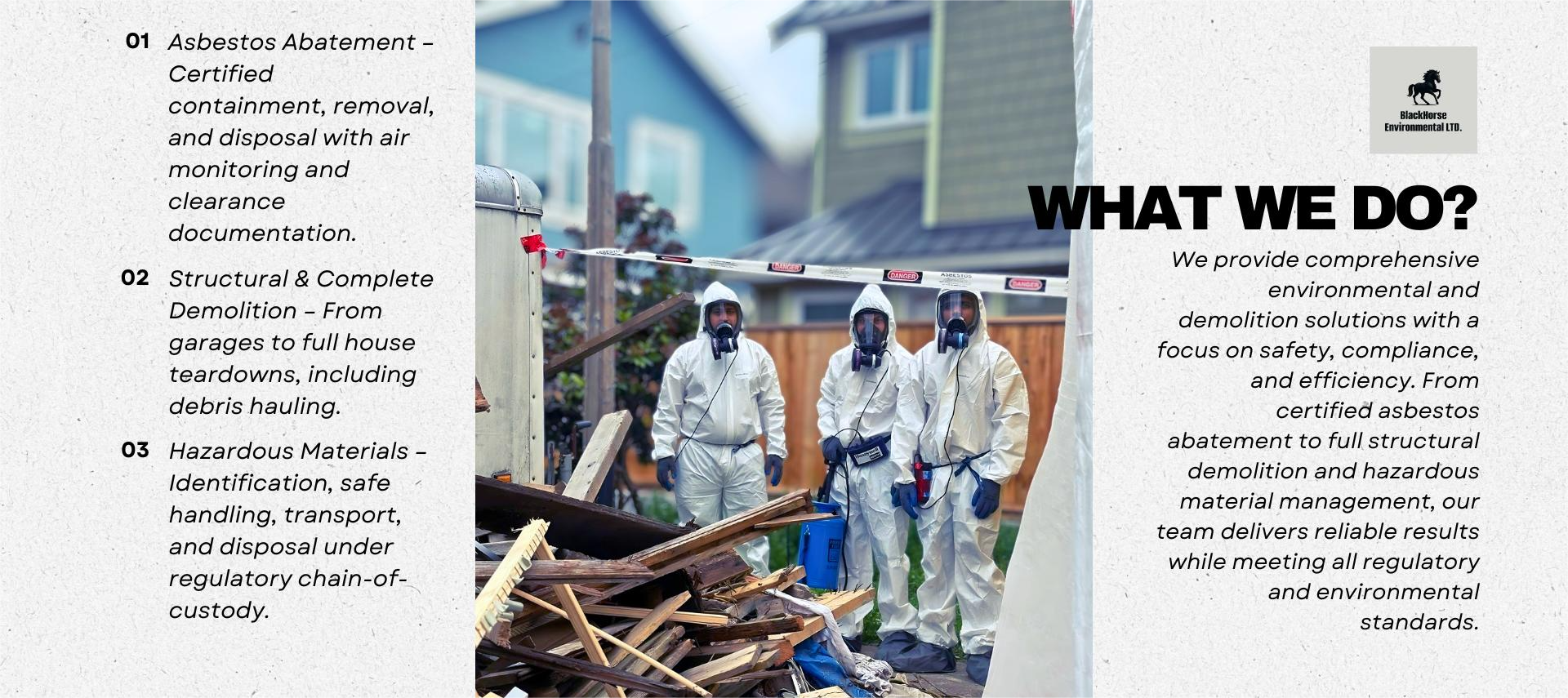 Welcome to Blackhorse Environmental Ltd., a trusted name in asbestos abatement, testing, and demolition across British Columbia.